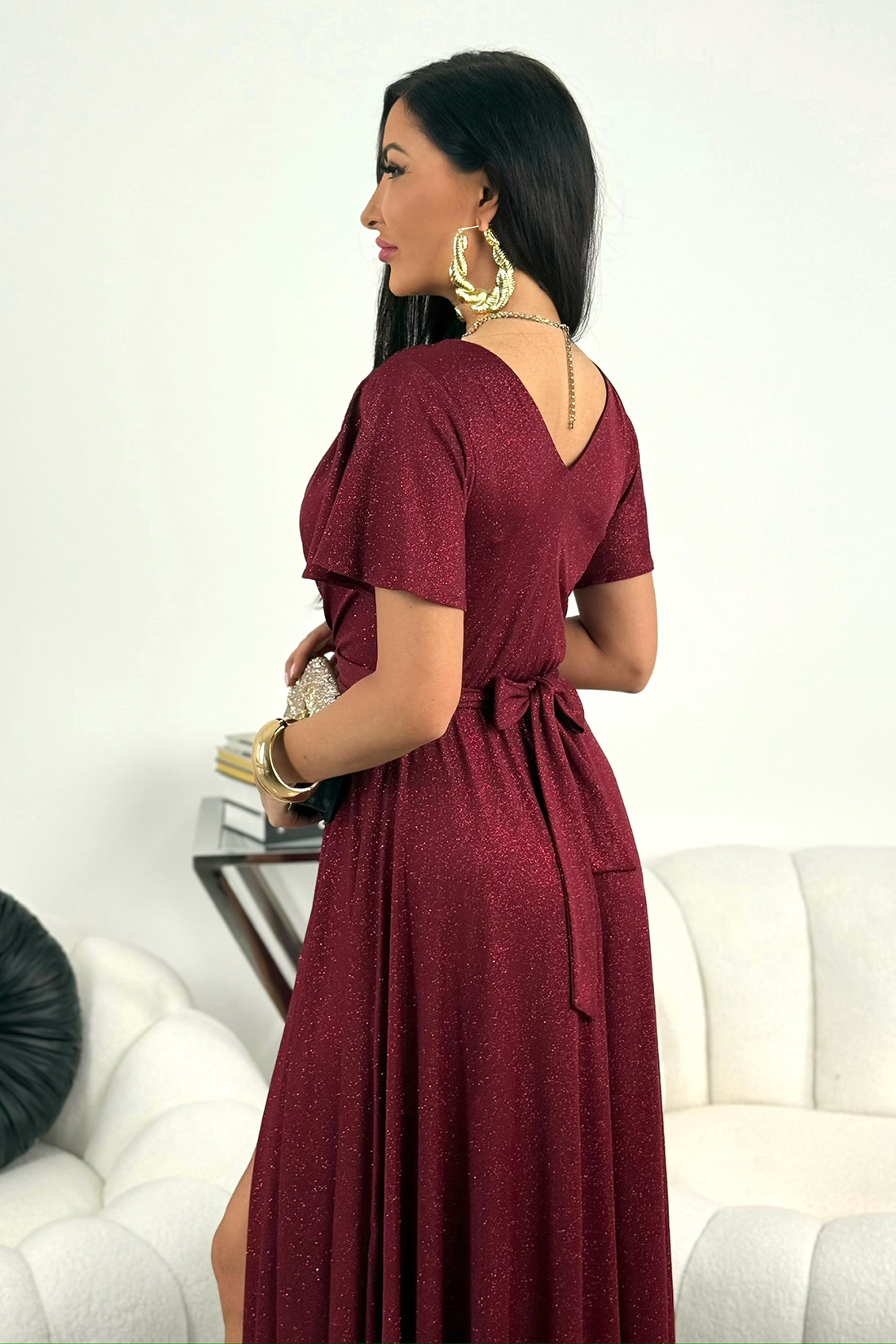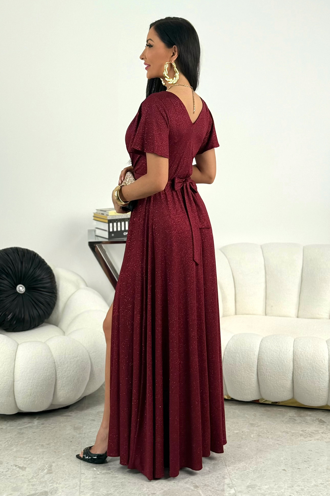 Długość maxi w połączeniu z rozkloszowanym dołem zapewnia klasę. Z tego powodu bordowa kreacja przepięknie układa się podczas tańca. Dodatkowo motylkowe rękawki dodają subtelności oraz wysmuklają ramiona. Co więcej, wiązany pasek i gumka pozwala na indywidualne dopasowanie sukni do Twojej talii. W rezultacie Twoja sylwetka nabierze idealnych, kobiecych proporcji. Dlatego ten fason zawsze prezentuje się zjawiskowo zarówno na żywo jaki i na zdjęciach. W efekcie podkreślisz swój indywidualny charakter.