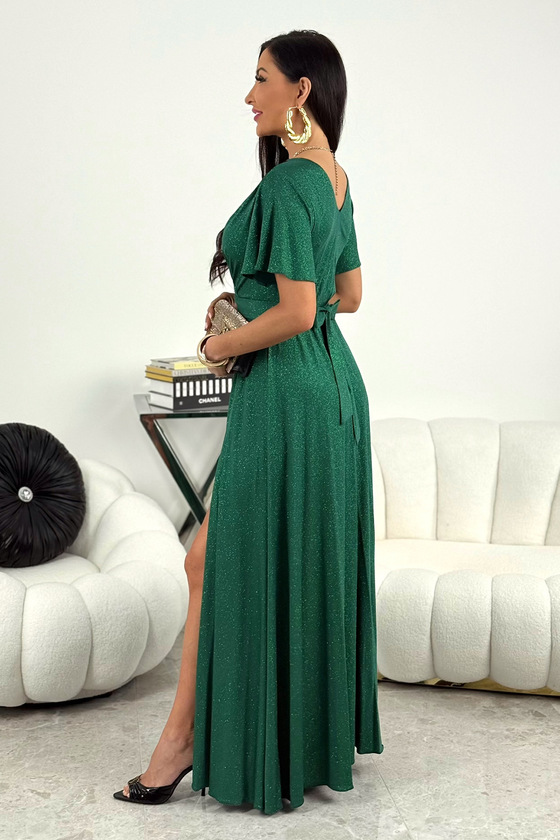 BELLA – butelkowa zieleń brokatowa sukienka maxi z rękawkami