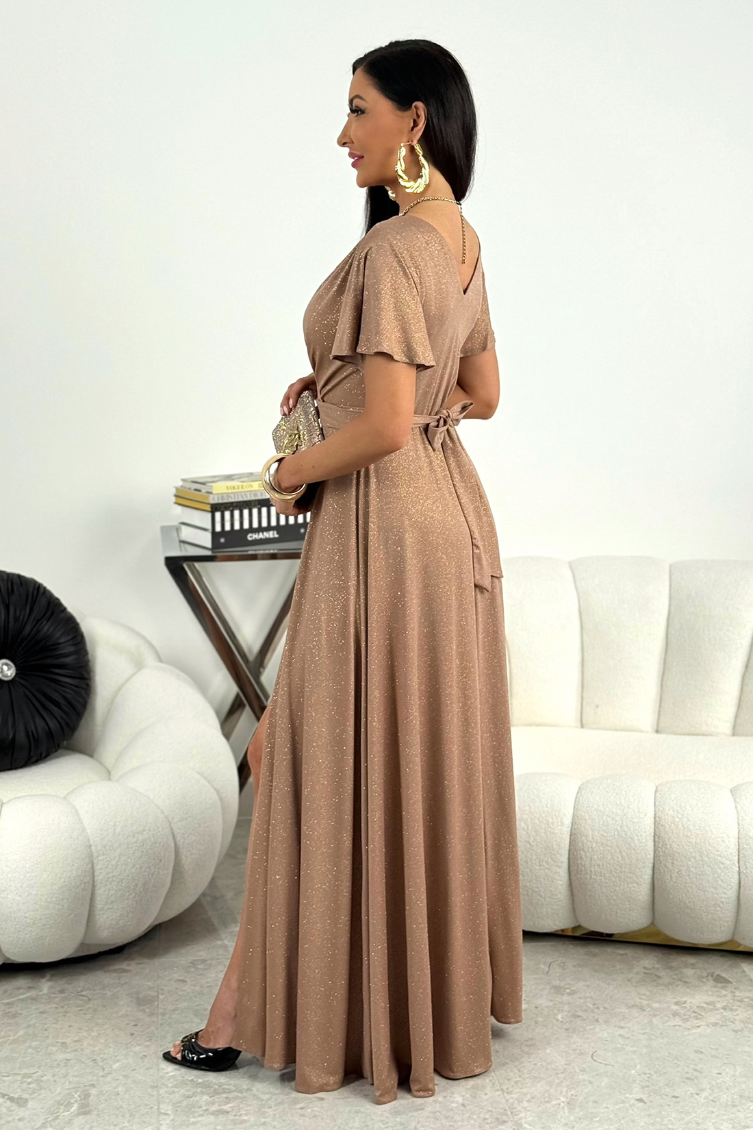 Elizabeth Collection tworzy sukienki z myślą o kobietach, które oczekują najwyższej jakości, perfekcyjnego kroju i nowoczesnej elegancji. BELLA – cappuccino brokatowa sukienka maxi z rękawkami to model, który łączy wygodę z luksusowym wyglądem i doskonale wpisuje się w aktualne trendy.