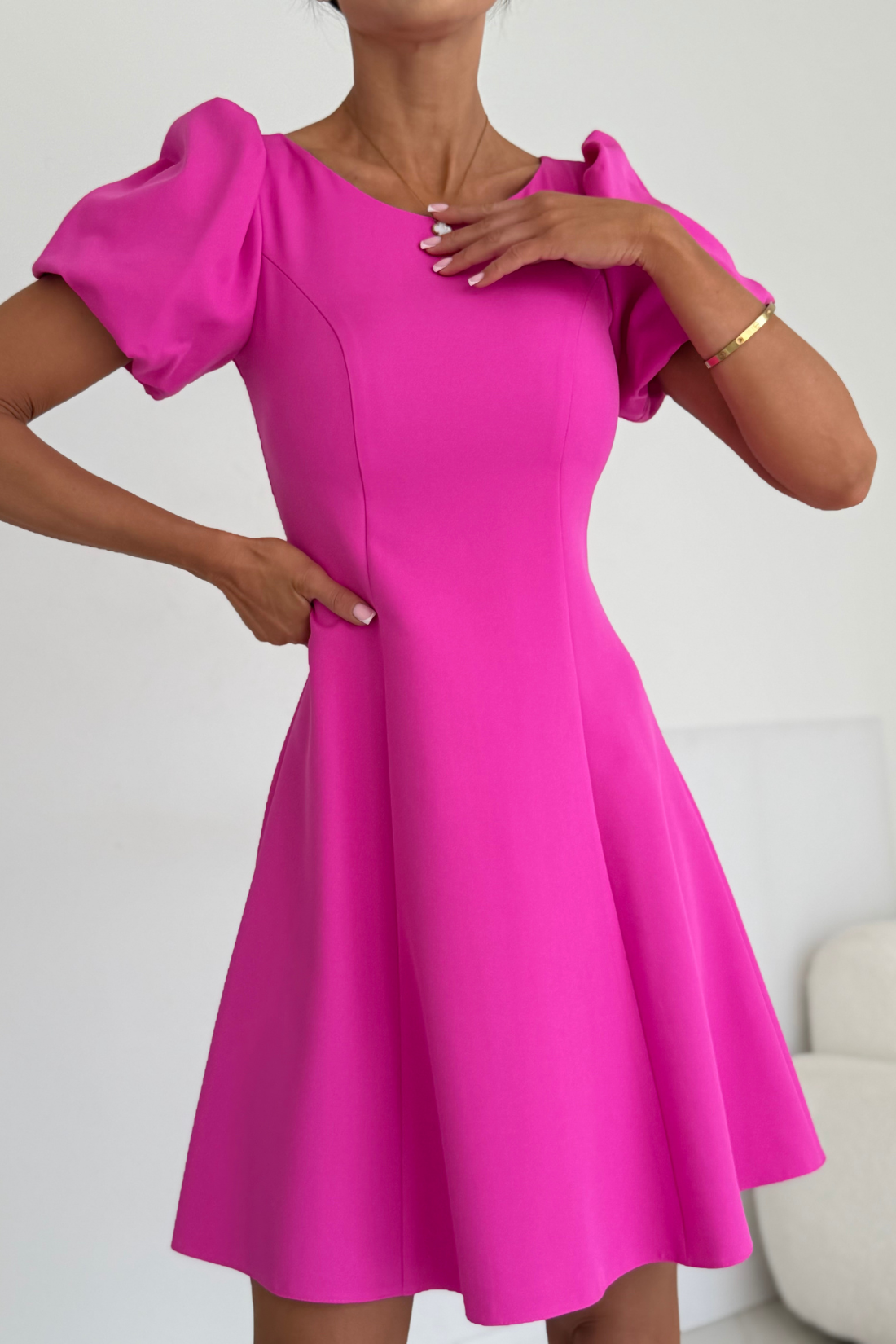 CHANEL – fuksjowa sukienka mini z balonowymi rękawami