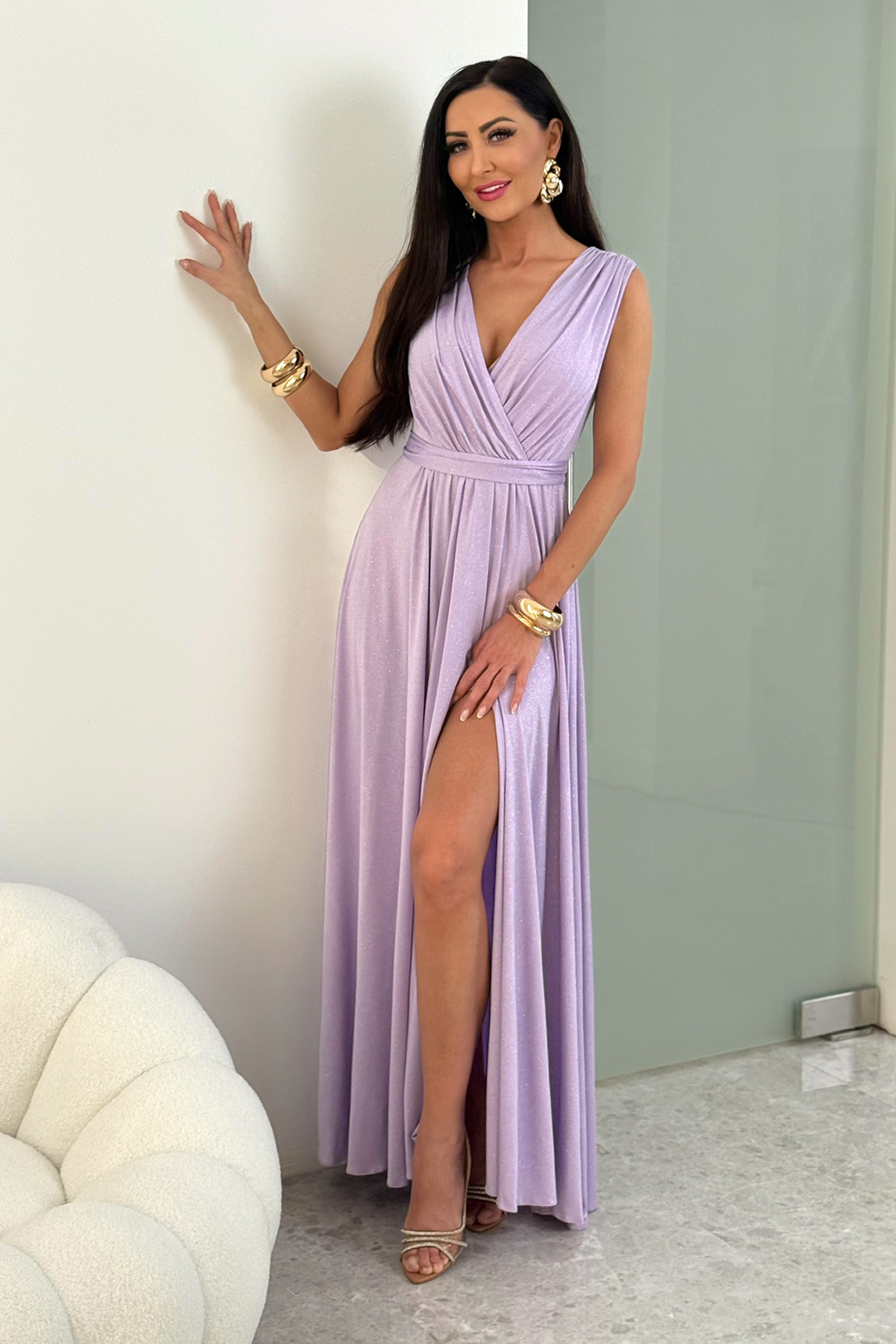 SALMA – elegancka jasno fioletowa brokatowa sukienka maxi na ramiączkach