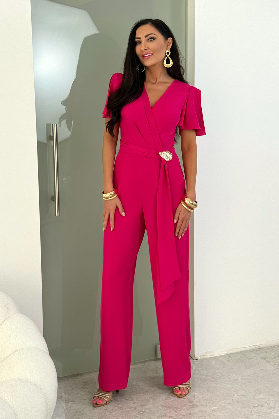TRIS – fuksjowy elegancki kombinezon damski ze złotą klamrą