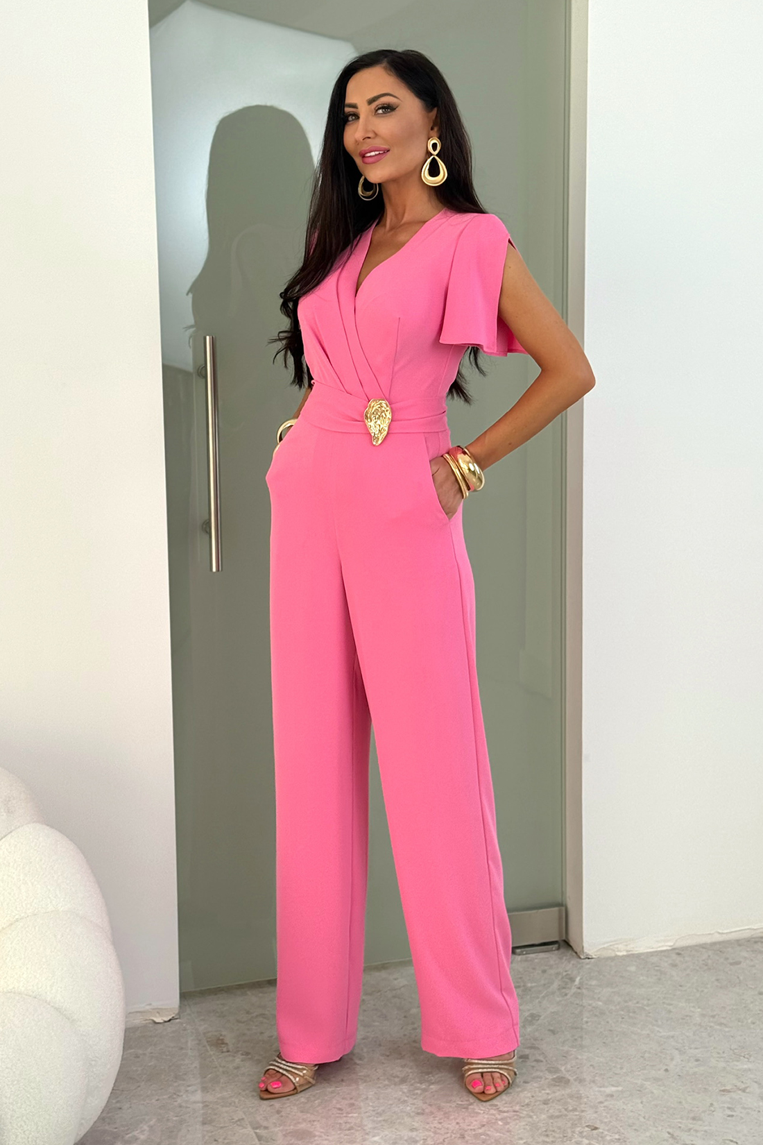 TRIS – różowy elegancki kombinezon damski ze złotą klamrą